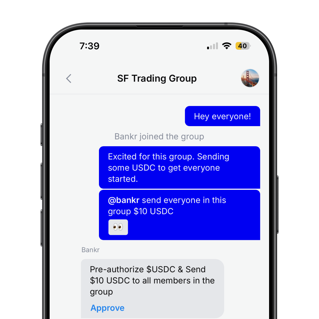 Add @Bankr to a group chat and you can: