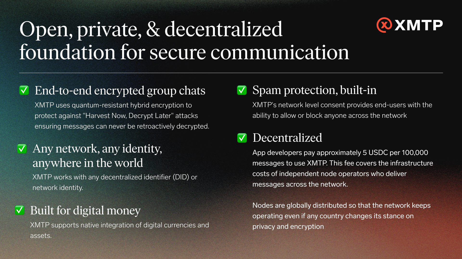 Messaging shouldn’t depend on trusting a single company. XMTP makes privacy a protocol guarantee—not a promise.