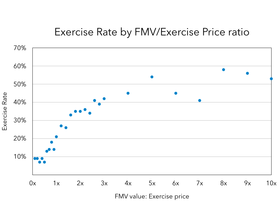 According to an analysis done by Carta showed some shocking statistics on the rate of exercise. They found that when the stock had reached an 8x fair market value to the exercise price rate, 40% of people still didn’t exercise the options. If the cost to exercise increased over $125,000 they found that over 70% of people didn’t exercise.